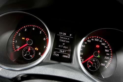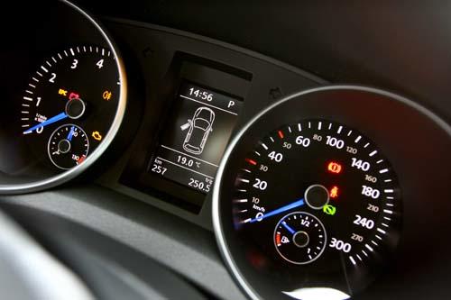 | Golf R儀表板采用藍色指針,這是R系車款慣用的配色,GTI則采用標準的紅色,兩者相比,Golf R的冷冽視覺效果十分特別。 |