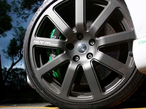 華麗外觀~霸氣vs.夸張 VW Golf R為了因應大幅度增強的動力系統(tǒng),Golf R的外觀造型與一般的Golf GTI不太相同,造型不同的前后保桿與尺寸更大的輪轂是外觀上最大的特征。VW在去年成立了R GmbH專司開發(fā)性能化套件,我們相信未來會出現(xiàn)更多也更運動化的作品;在輪轂部份,為了對應Golf R更為強烈的動力輸出,輪轂也裝上特制的19寸Talladega輪轂,買家還可選擇拋光銀或是亮面黑色涂裝。 MTM Golf GTI跟一般的Golf相比,GTI的外觀造型已是偏向運動化的設定,但改裝廠總有比原廠更夸張的造形設計,讓喜好與眾不同的車主擁有更多的外觀造型選擇。本次出場的GTI,在外觀部份也進行了相當幅度的修改,全套空氣力學套件采用CARACTERE制品,此一套件包括前后保桿與側裙,而為了搭配空氣力學套件,車上使用的KTi排氣管尾段也經(jīng)過相當程度的修改,以配合整合于保桿當中的排氣尾飾管。 這部車的另一個視覺重點在于MTM 19寸鍛造鋁合金輪轂,這組名為Bimoto的輪轂是MTM的經(jīng)典款,此一輪轂的造型設計雖然較為簡單,但鍛造制品的堅固與輕量則是無可取代的優(yōu)點。為了使用這組輪轂,輪胎尺寸也由原本的225/45/17一口氣跳級至235/35/19,更寬扁的輪胎也換來較原廠設定更為優(yōu)異的抓地力。