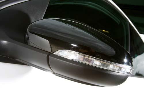 | 一度讓人以為是碳纖維制品的Golf R后視鏡上蓋,其實是高亮黑烤漆制品。 |