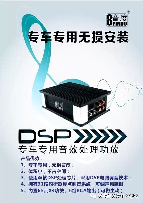 專車專用,無損音改;體積小,不占空間;使用雙核處理芯片,采用DSP電腦調(diào)音技術(shù);擁有31段均衡器浮點(diǎn)調(diào)音系統(tǒng),可調(diào)音場延時功能;內(nèi)置65W×4功放,6組RCA輸出(可做主動分頻)。8音度DSP專車專用音效處理功放在功能和安裝便捷性方面均取得突破性提升,引領(lǐng)汽車音響改裝向更加便捷,更加個性化方向發(fā)展。