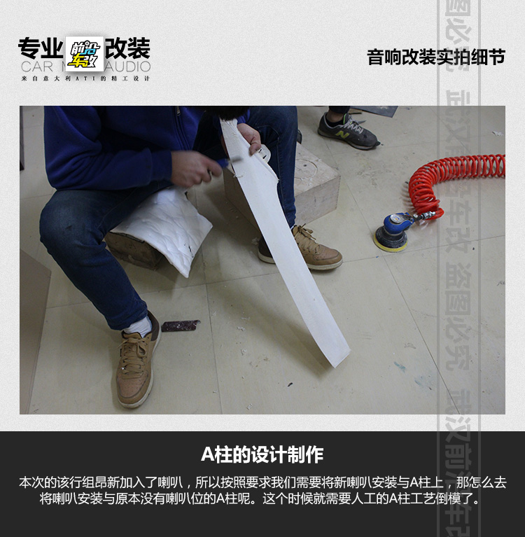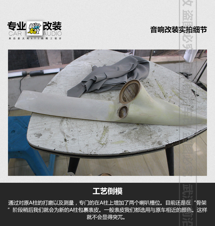 通過(guò)對(duì)原A柱的打磨以及測(cè)量,專門(mén)的在A柱上增加了兩個(gè)喇叭槽位。目前還是在“骨架”階段稍后我們就會(huì)為新的A柱包裹表皮。一般表皮我們都選用與原車相近的顏色。這樣就不會(huì)顯得突兀。