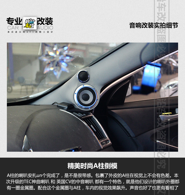 A柱的喇叭安扎un個(gè)完成了,是不是很帶感。包裹了外皮的A柱在視覺(jué)上不會(huì)有色差。本次升級(jí)的TEC神曲喇叭 和 英國(guó)CV的中音喇叭 都有一個(gè)特色,就是他們?cè)O(shè)計(jì)的喇叭外圈都有一圈金屬圈。配合這個(gè)金屬圈與A柱,車內(nèi)的視覺(jué)效果飆升。聲音也好了也更有看相了
