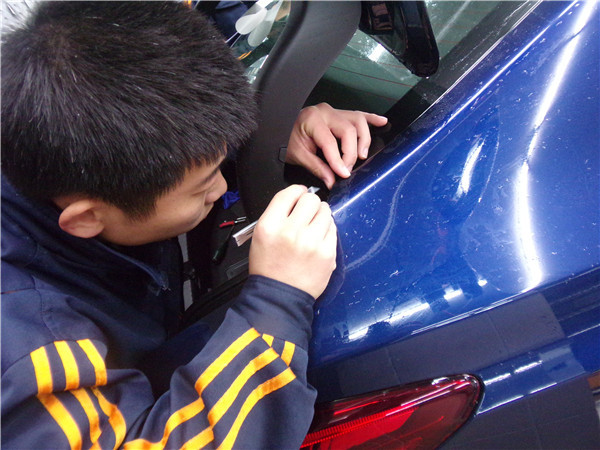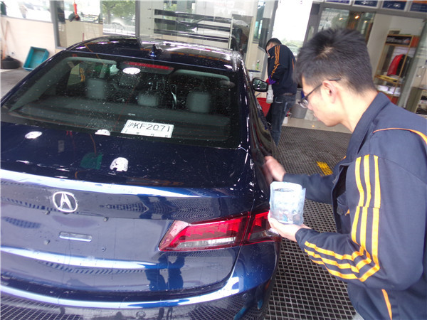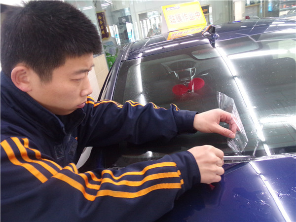 全車施工,需要取下原車鍍鉻部件(原車鍍鉻部件是汽車廠家用膠粘住的,技師使用刮板和烤搶施工,不會損傷漆面,施工完畢后在從新粘回即可);技師測量車身面板長度,根據(jù)車身結(jié)構(gòu)分塊施工,未來透明膜有破損需要從新貼膜時,也簡單操作,降低車主資金成本。