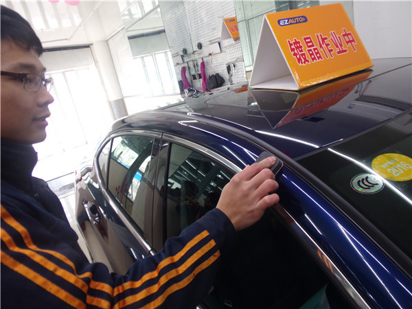 施工步驟首先精致洗車除去車身污垢,對將要施工的部位,利用清潔液進行多次清潔,去除所有的灰塵與沙粒;然后是鍍晶的相關(guān)步驟:拋光-去脂-二次洗車-鍍晶-擦拭-晾干等,此處省略。