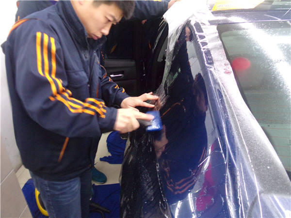 清洗完畢,采用濕貼貼膜,拿出裁剪好的貼膜,撕掉膜的背紙,注意先把手弄濕,手盡量不要觸碰到背紙,因為會留下難以去除的指紋,濕手撕去背紙后,立即用酒精溶液(貼膜液)均勻地噴灑在車膜與車漆上面。達到最大的潤滑度,方便接下來的貼覆施工,烤搶烤出車身弧度,刮板趕凈水分,使透明膜緊緊吸附在車身上。