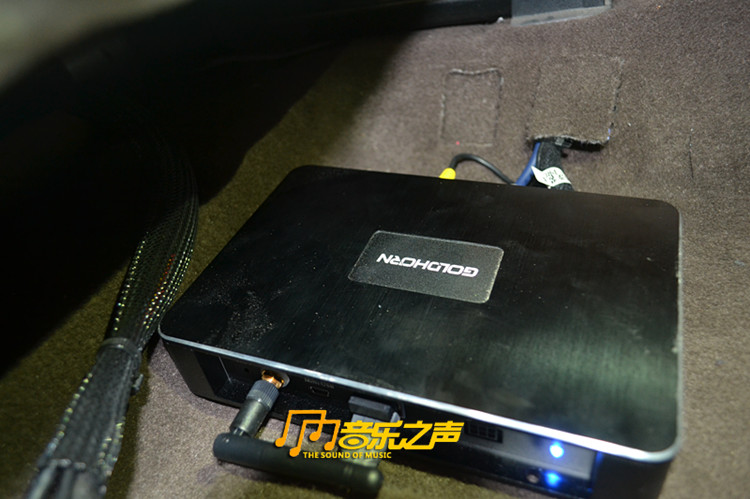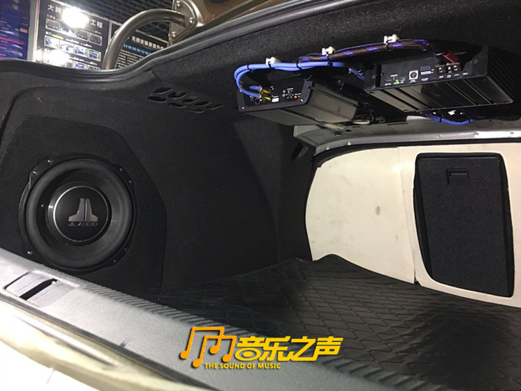 兩臺(tái)功放低調(diào)吊裝在后備箱蓋板上方,不占用空間的同時(shí),又可以便于日后調(diào)試和檢修。