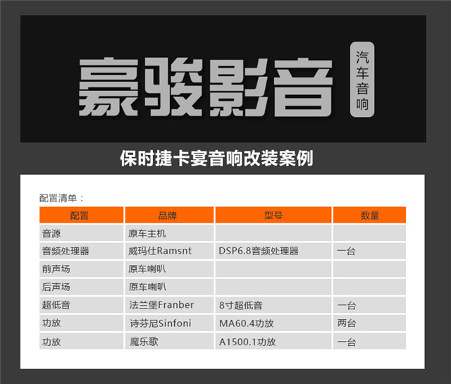 音質感決定駕乘快感,出眾的音樂源自成熟的技術,高雅的品味來自一流的品質。高貴尊雅的卡宴在汽車音響的選擇上是否知己難尋?動人的聲音,優(yōu)美的歌曲,享受風,享受陽光,一首好歌,一段音樂,絕對會讓自己的感覺升華。車主特別喜歡曼妙真實的發(fā)燒抒情人聲歌曲,演繹這類型的HI-FI音樂,需要汽車音響系統(tǒng)擁有細膩通透、清晰純正的高音效果,飽滿富有質感的中低頻,以及深邃飽滿的低頻效果,但原車音響很難滿足以上要求。為此,卡宴車友選擇升級汽車音響。車主駕車來到“佛山豪駿影音改裝”經(jīng)過試聽對比之后,卡宴車友最終選擇以下高端汽車音響配置進行升級