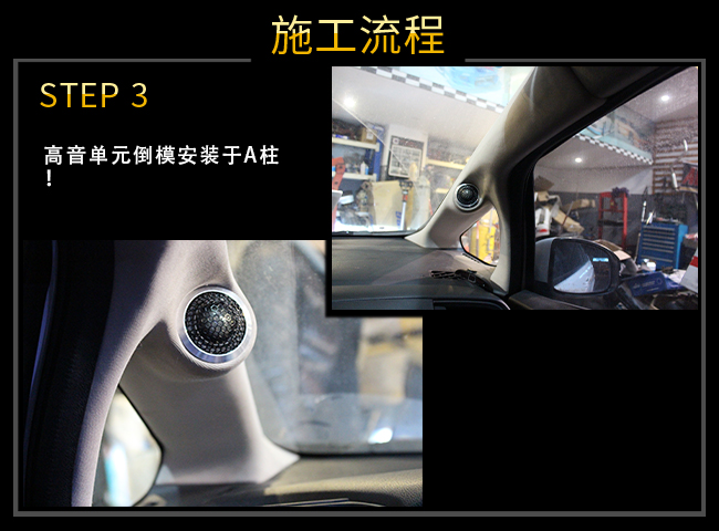 高音單元倒模安裝于A柱,使整個(gè)聲場(chǎng)會(huì)變得寬廣,高音聽起來(lái)更通透靈動(dòng)。