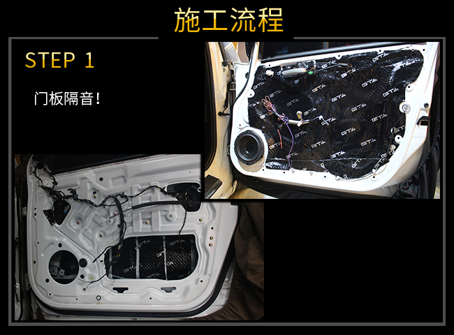 首先車門進(jìn)行雙層隔音處理,隔音并不是盲目的貼上去的,都是嚴(yán)格按照車門的形狀來(lái)剪裁的,而且非常準(zhǔn)確的保留原車的各個(gè)線路和孔位。既美觀又能保證隔音的效果。