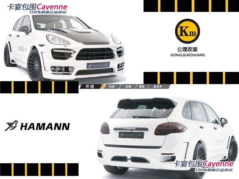上海KM改裝俱樂部擁有歐洲MANSORY、HAMANN、LUMMA、KAHN等三十多個(gè)專門針對保時(shí)捷、路虎、奔馳、寶馬、奧迪、進(jìn)口大眾六大汽車品牌的改裝產(chǎn)品,并擁有專業(yè)的設(shè)計(jì)團(tuán)隊(duì)為高端車主提供個(gè)性化定制服務(wù)。KM將成為全國范圍內(nèi)產(chǎn)品最廣、單位面積最大、設(shè)施最齊全、檔次最高的國際超級豪車改裝旗艦店。此產(chǎn)品:Porsche保時(shí)捷卡宴全進(jìn)口原裝包圍Hamann品牌。