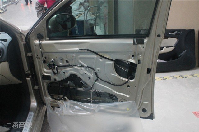 大眾朗逸原車前門,處理一層薄膜之外,原車門內(nèi)并未進(jìn)行任何隔音施工