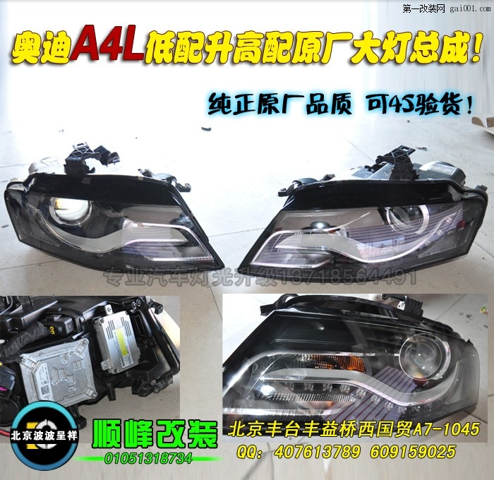 奧迪A4L低配升高配大燈總成 北京波波實體店改裝 無需改線 直接對插 無破壞的原裝位改裝即可擁有高配車氙氣燈的外觀和高亮燈光電話:13718564491QQ:393226128 ...